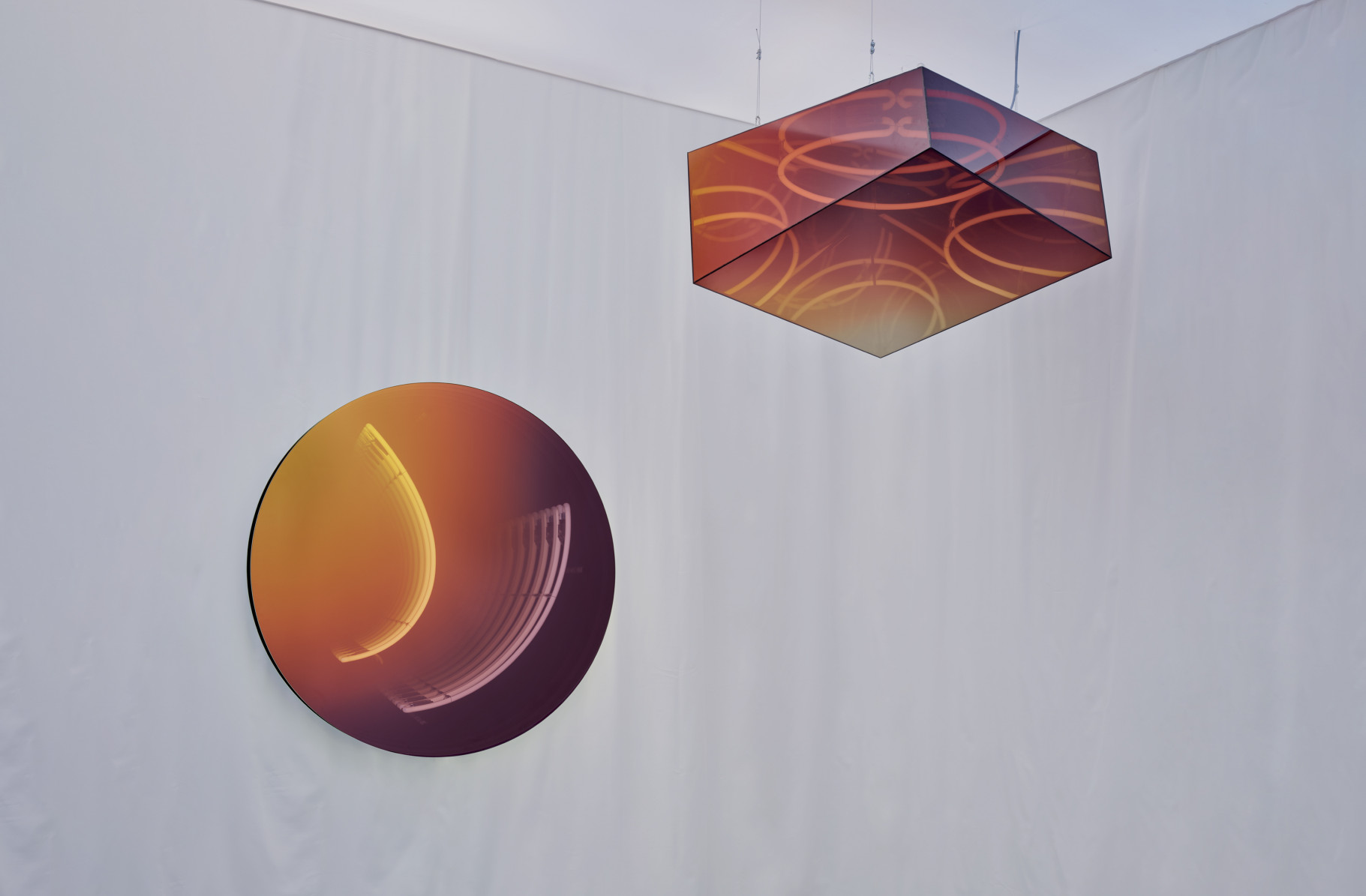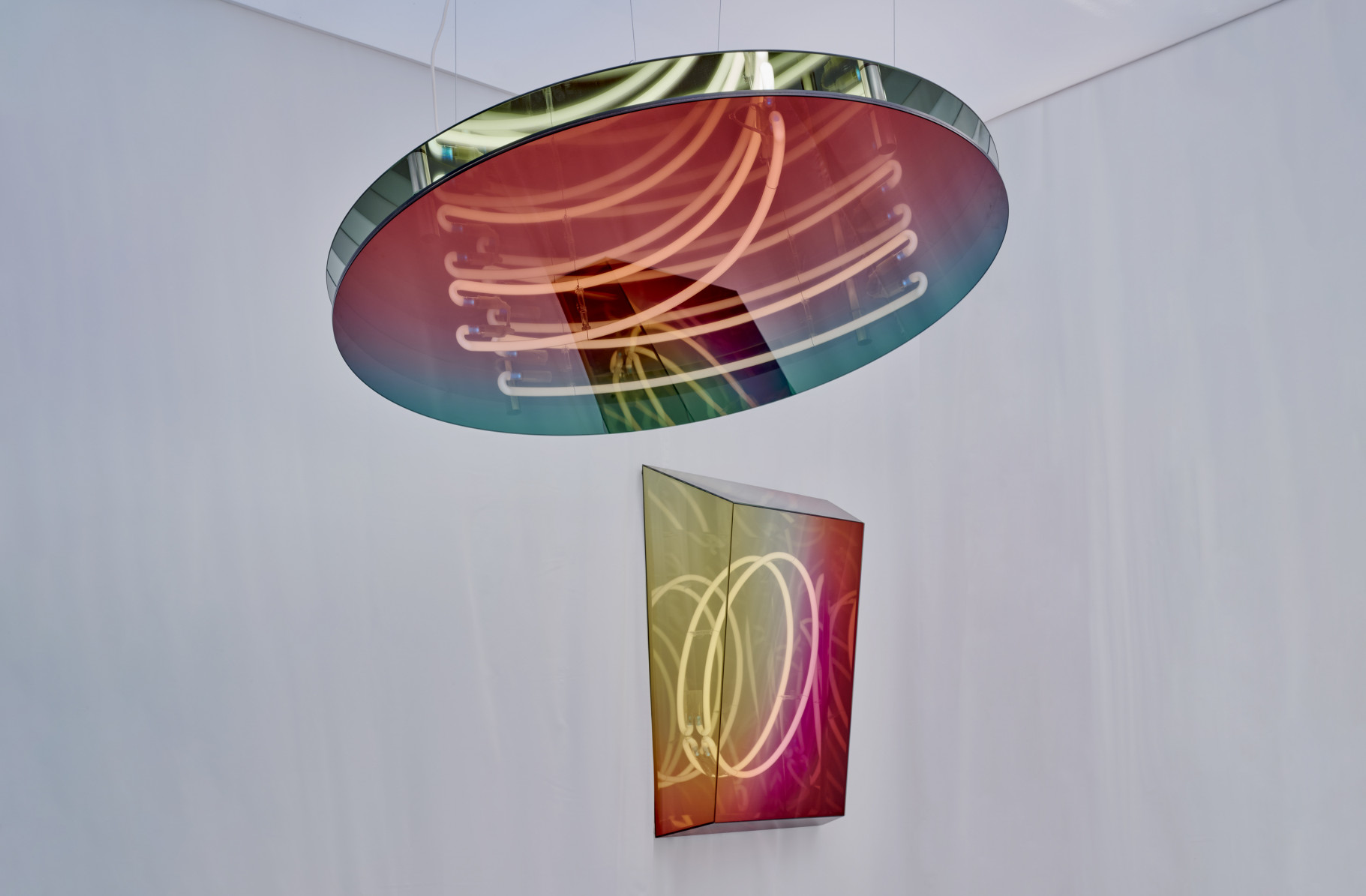 In continuation of her explorations of light interactions, Rise delves into the possibilities of layered mirrors and neon lights to simultaneously create optical illusions of infinity and colour filtered reflections of the world that is, resulting in hybrid works that are both mirrors when turned off and lights when turned on.