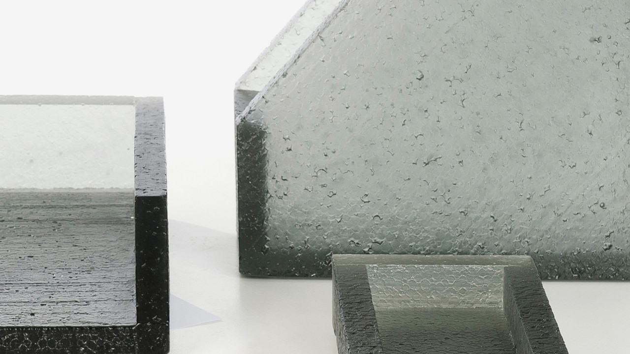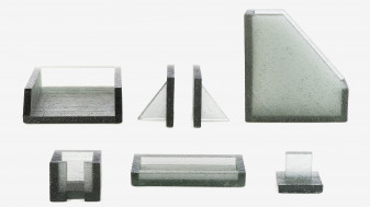 The Block series are made using a glass casting method inspired by the well-known lost-wax technique. Instead of using wax (cast from a mould, itself cast off a master piece), each piece is made and assembled by hand using expanded polystyrene (eps) board as base material. Plaster moulds are made from these eps forms, and then burnt. Hot glass is then transferred into these moulds. Subsequently, each piece resulting from this process is unique. Such a technique allows to cast the eps in glass, whilst retaining the exceptionally fine details that form the surface texture of the original eps board, itself originating from another moulding process of the chemical polymer industry. The fine moulding technique allows its imperfections to be retained in the surface of the resulting glass. Read more