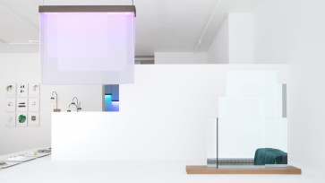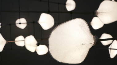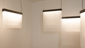 light volumes is a delicate silk-made luminaire. Three different sized silk loops rest in one another and are illuminated. The light gently flows into the silk and the very thin, nearly transparent silk turns visually into various volumes of light creating a special atmosphere. Each lamp can shine in warm white light as well as in a dedicated colour. They give off a very even illumination that almost appears to be caught in the fabric. Suspended from the ceiling, light volumes can be used as an ambient light in front of a wall, above a table or as well as airy room divider whilst at the same time it can give colour to a space. With every gentle breeze the characteristic flow of the silk becomes visible and little ripples float across the fabric. Read more