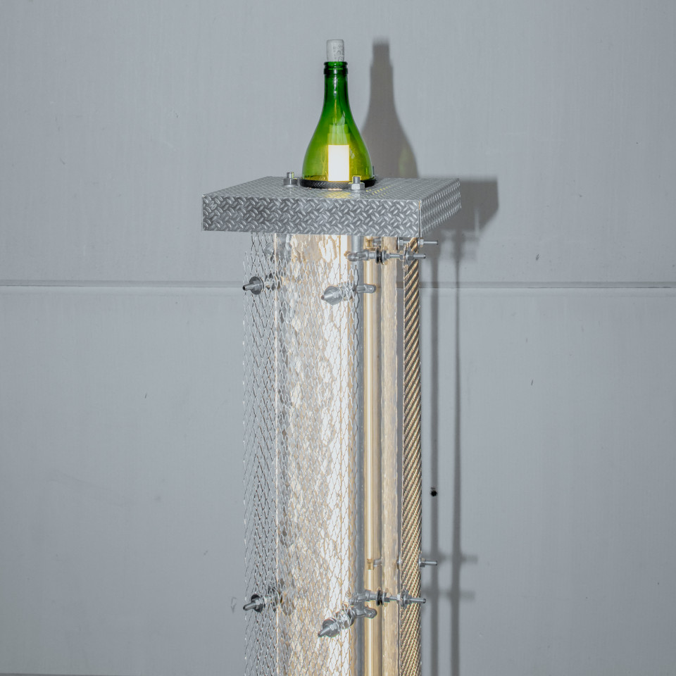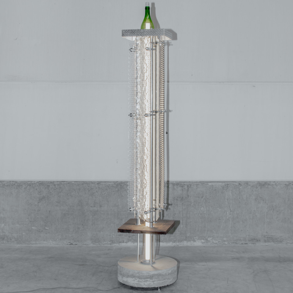 • galvanised steel, glass bottle, bolts, steel grid, aluminium, wood, concrete, led tube