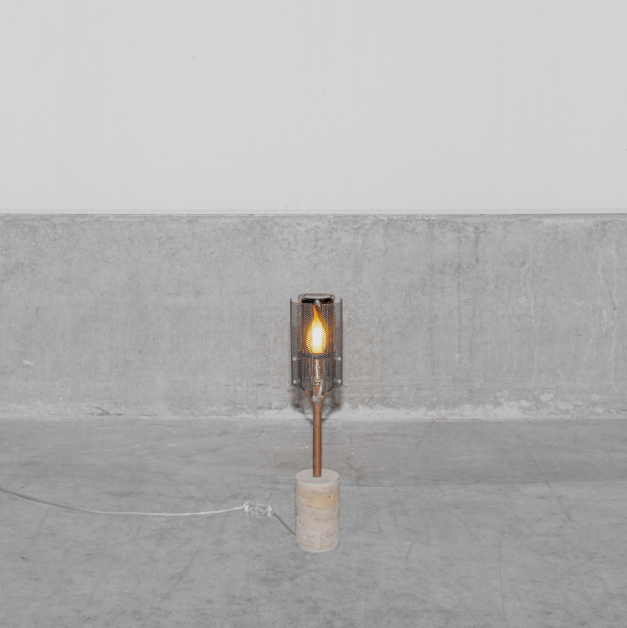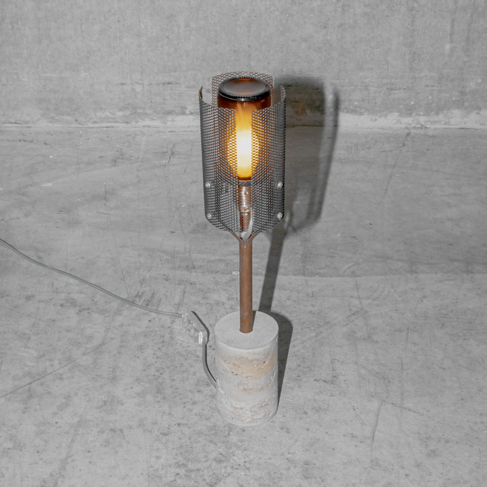 • concrete, glass bottle, bulb, copper tube, steel grid, bolts