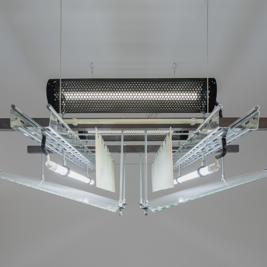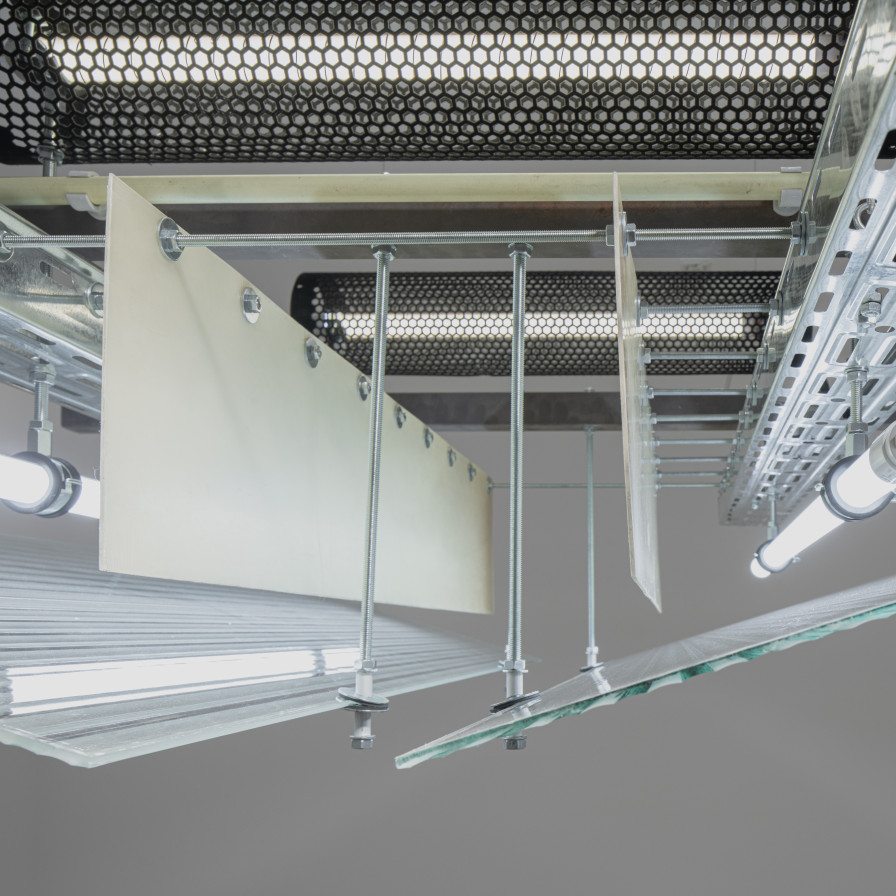 • painted steel, galvanised steel, moulded glass, plexiglass, led tube & perforated steel tube