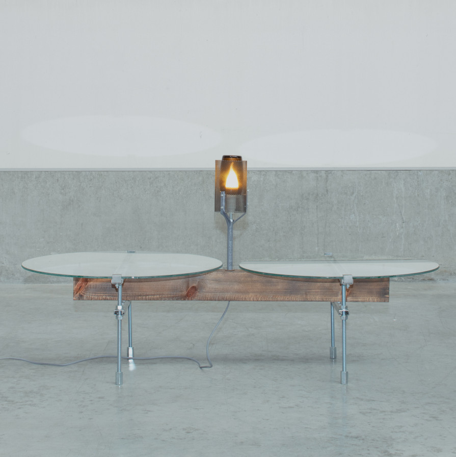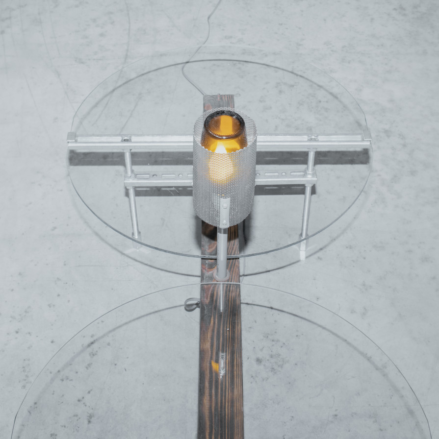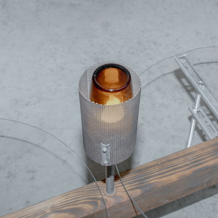 • galvanised steel, bottle, bolts, glass, wood, steel grid, bulb Pvc tube