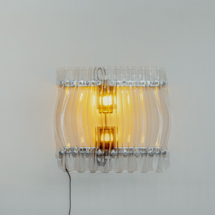 • galvanised steel, glass bottle, bolts, soft pvc sheet, bulb